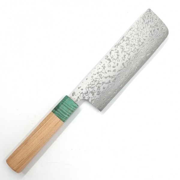 - 鋭い切れ味の持続性と粘り強さを併せ持つステンレス刃物鋼VG7を切れ刃に使用した17層のダマスカス模様が特長的な菜切包丁です。